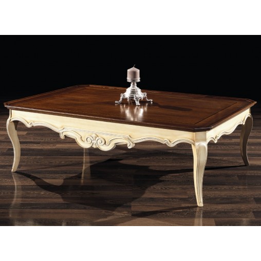Κλασικό τραπέζι σαλονιού με καπάκι από ξύλο καρυδιάς και βάση από μασίφ ξύλο οξιάς. Έχει ιδιαίτερο σκάλισμα στην τραβέρσα και μπορεί να βαφεί σε χρώματα της επιλογής σας. Διατίθεται επίσης τραπέζι φαγητού, έπιπλο τηλεόρασης και βιτρίνα με το ίδιο σκάλισμα.
