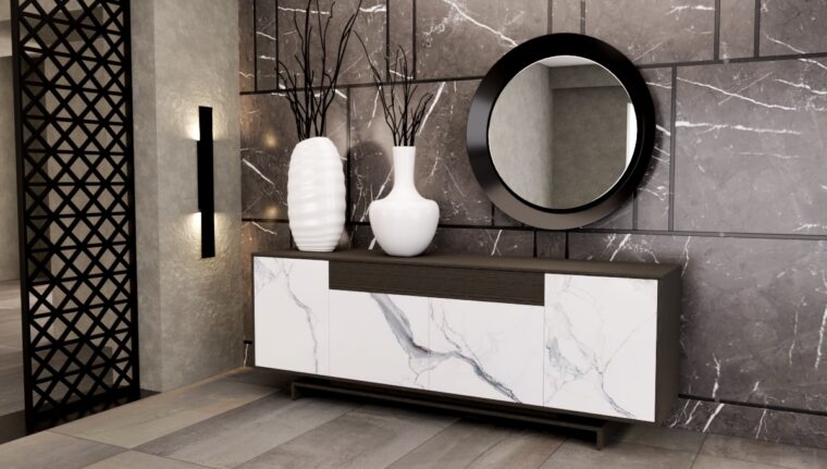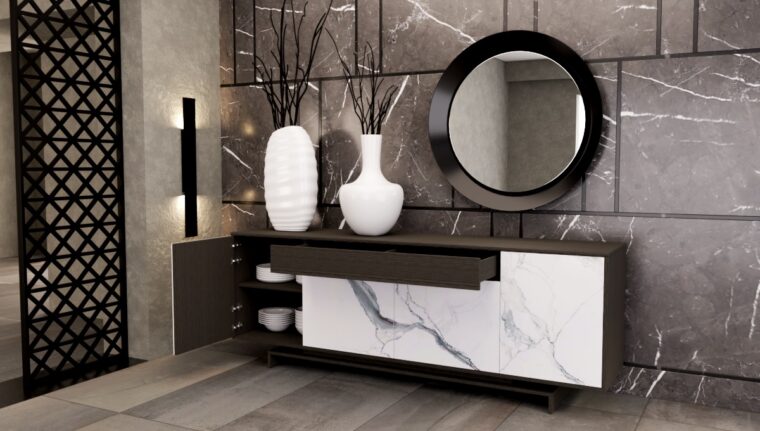 Φινέτσα και διακριτική πολυτέλεια. Πρωτοποριακό design βασισμένο στην νέα τάση παγκοσμίως στο πάντρεμα κλασσικών υλικών με νέα υλικά. Ξύλο, λάκα και έντονα κεραμικά στοιχεία σε ένα σύνολο μοναδικής αισθητικής. Συνδυάζεται με την τραπεζαρία Block. Τον μπουφέ Block τον κατασκευάζουμε σε διαστάσεις και χρώματα της επιλογής σας.