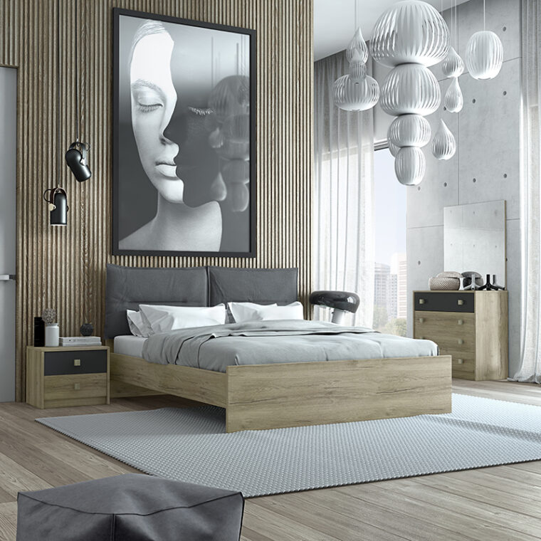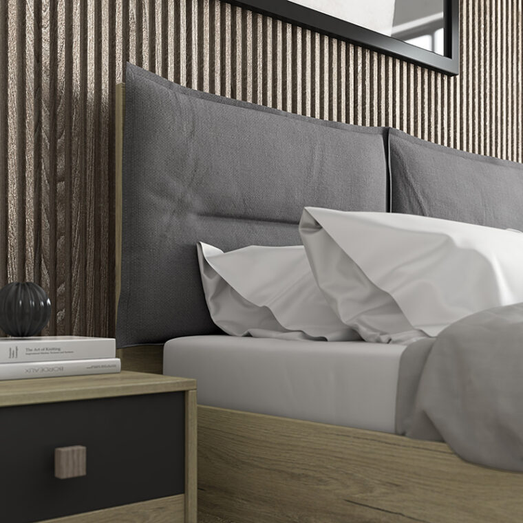 Μοντέρνο σετ κρεβατοκάμαρας σε τεχνοτροπία ξύλου με αποσπώμενες μαξιλάρες στο κεφαλάρι σε γκρι απόχρωση. Διαθέσιμο μόνο σε συγκεκριμένη απόχρωση και διαστάσεις.