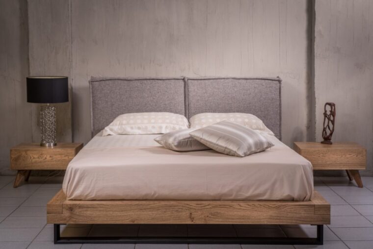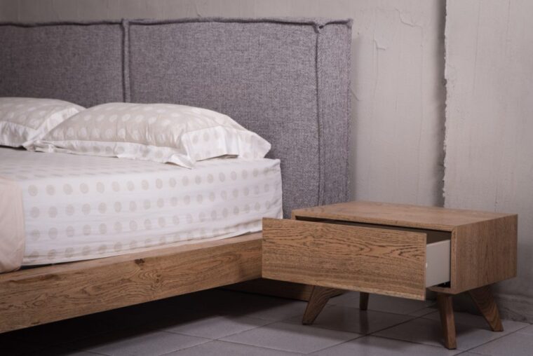 Eντυπωσιακή κρεβατοκάμαρα, σε χαλαρές γραμμές με μοντέρνα σχεδίαση και την ύπαρξη υφάσματος σε συνδυασμό φυσικού ξύλου δρυός. Ωραία κυβιστική γραμμή με την λεπτομέρεια από το σιδερένιο πόδι μπροστά και τα εντυπωσιακά χρώματα του ξύλου.