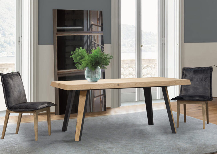 Τραπέζι με επιφάνεια δρυς ρουστίκ και μεταλλική λεπτομέρεια στο πόδι και προέκταση.