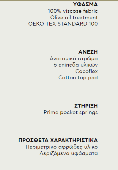 Prime Support στήριξη, στρώση CocoFlex που έχει σαν πρώτη ύλη τον κοκοφοίνικα και 3 επιπλέον στρώσεις μαλακών υλικών, περικλείονται στο μοναδικό ύφασμα από 100% βισκόζη (με πιστοποίηση OEKO TEX STANDARD 100), επεξεργασμένο με ελαιόλαδο. Οι Kamares είναι το πρώτο στρώμα της Inventor Collection με Olive Oil Treatment.