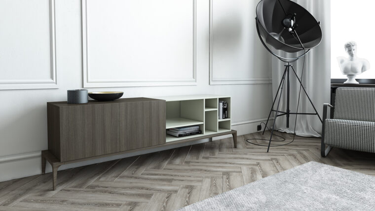 Βάση σε δρυς και μασίφ πόδια οξιάς. Ντουλάπι με δύο πόρτες.