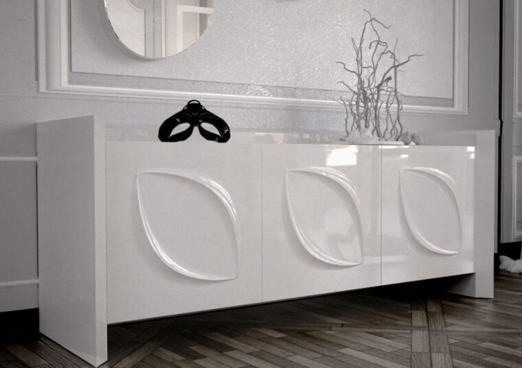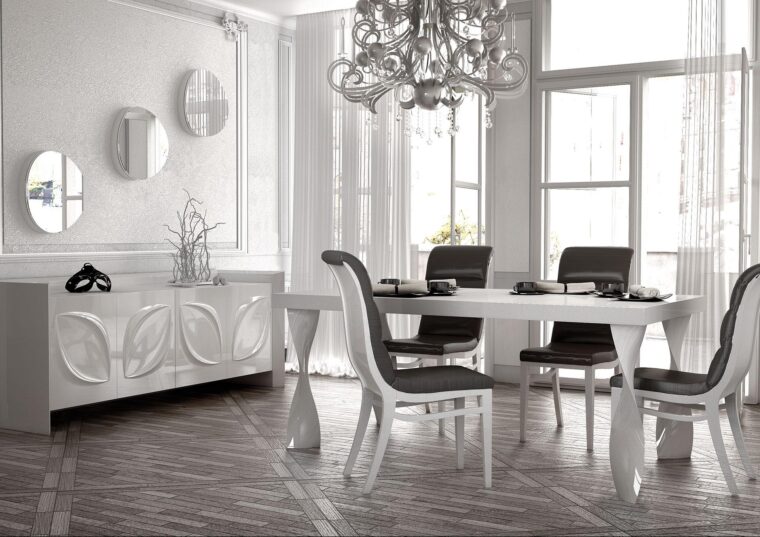 Τραπέζι τραπεζαρίας σε λάκα γυαλιστερή , όπου η  επέκταση των ( +50 εκ) , βρίσκετε μέσα στην επιφάνειά του. Η επιφάνεια του τραπεζιού , μπορεί να είναι και σε γυαλί securit. Τα πόδια από μασίφ οξιά βαμμένα σε λάκα γυαλιστερή. Ο μπουφές  και η βιτρίνα  είναι  επίσης σε λάκα γυαλιστερή. Όλη η σειρά London είναι  διαθέσιμη  σε οποιοδήποτε RAL χρώμα. Κάθισμα Νο 55 σε ύφασμα και βάση από μασίφ οξιά.