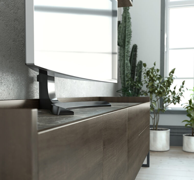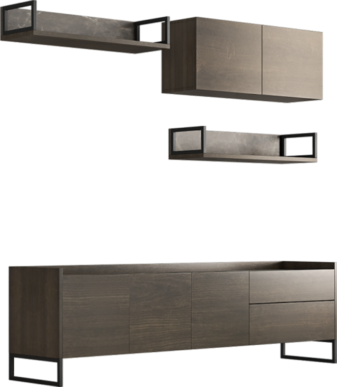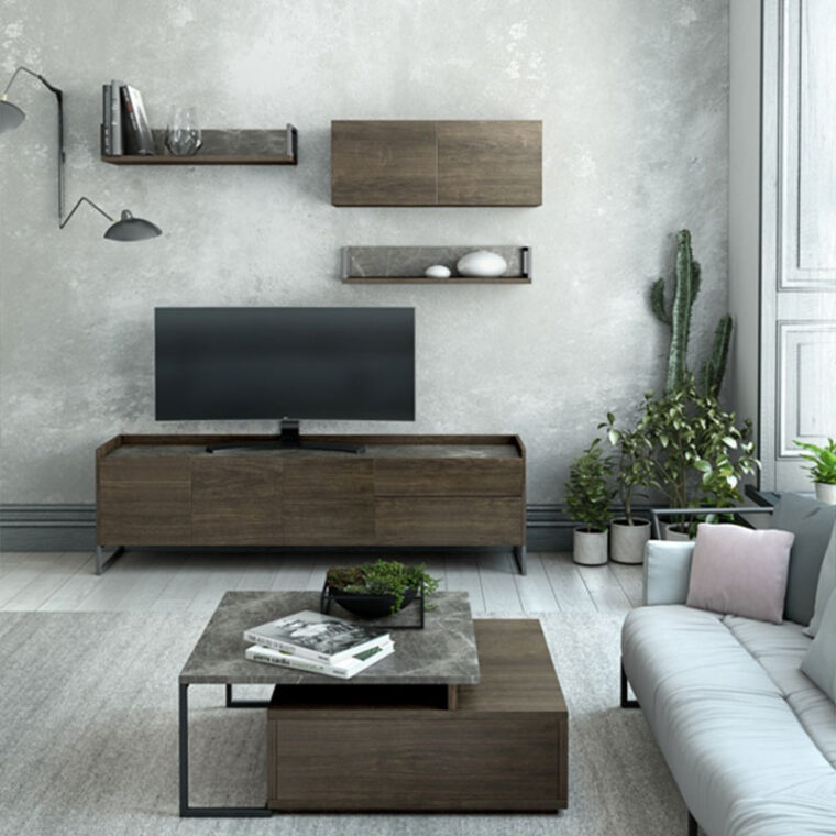 Μοντέρνα σύνθεση τηλεόρασης με τεχνοτροπία ξύλου σε σκούρα καρυδί απόχρωση και πινελιά με τεχνοτροπία μαρμάρου στην επιφάνεια. Διαθέτει μεταλλικά ανθρακί πόδια. Μπορεί να κατασκευαστεί και σε άλλους χρωματικούς συνδυασμούς καθώς σε σε άλλη διάσταση.