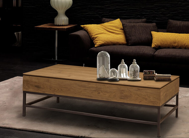 Τραπεζάκι σαλονιού με ρουστίκ επιφάνεια, μηχανισμού τύπου σερβιτόρου, αποθηκευτικό χώρο και μεταλλική βάση.