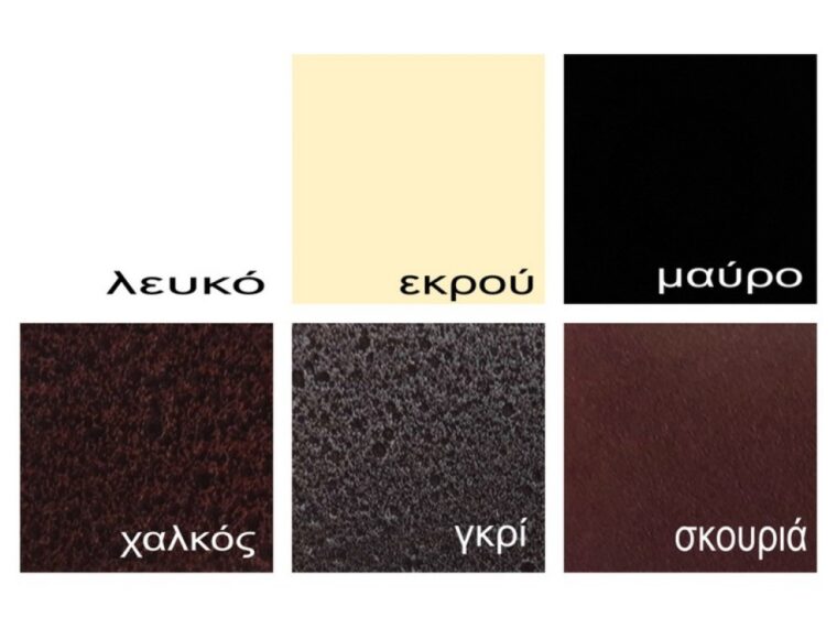 Διατίθεται σε 6 χρώματα ο μεταλλικός σκελετός: ΛΕΥΚΟ, ΕΚΡΟΥ, ΜΑΥΡΟ, ΧΑΛΚΟΣ, ΓΚΡΙ, ΣΚΟΥΡΙΑ.