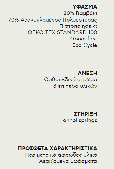 Αναγνωρίζεται από το κυψελοειδές μοτίβο του υφάσματος, φτιαγμένο από εξαιρετικής ποιότητας βαμβάκι και ανακυκλωμένο πολυεστέρα. Η πυκνότερη δομή ελατηρίων DuraAce Support ανταποκρίνεται καλύτερα σε σωματότυπους που έχουν αυτή την ανάγκη, ενώ μια επιπλέον στρώση Cotton Top Pad, θα συμβάλει σε μια εξαιρετική εμπειρία ύπνου.