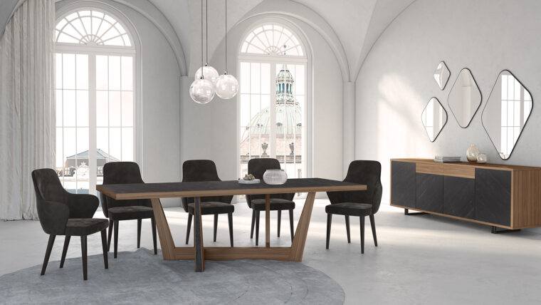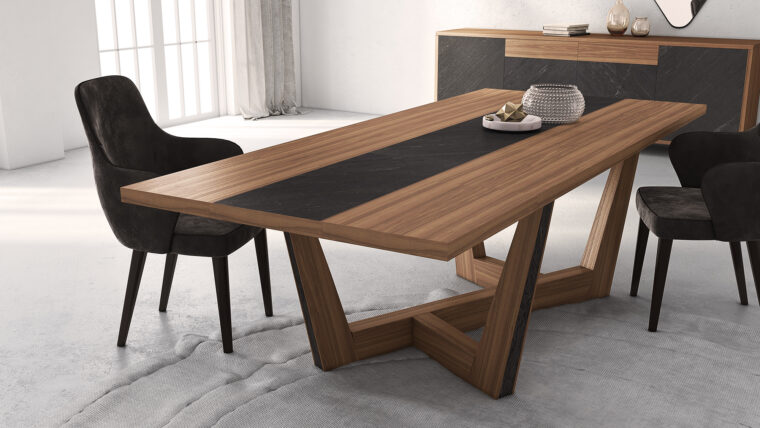 Τραπέζι σε δρυς. Η επιφάνεια του τραπεζιού όπως επίσης και τα κάθετα διακοσμητικά των ποδιών είναι από επένδυση πέτρας.