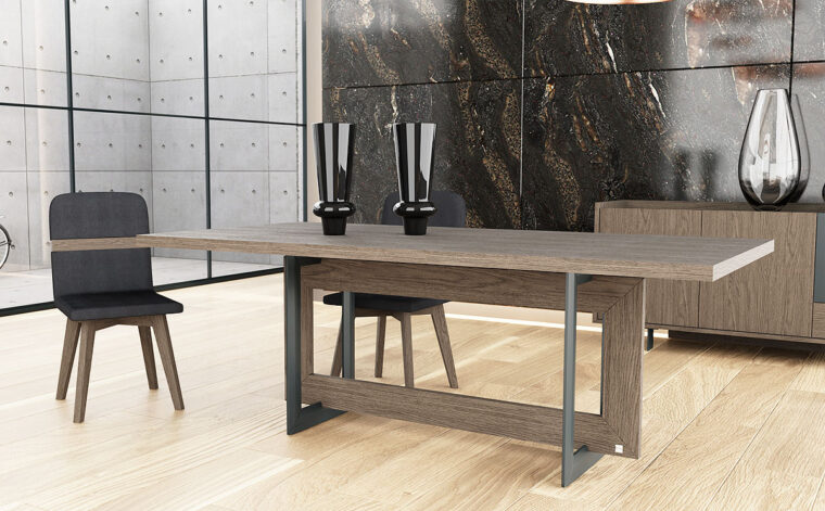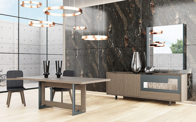 Οι καθαρές γεωμετρικές γραμμές και η ήρεμη διχρωμία δημιούργησαν ένα σύνολο που προσδίδει φινέτσα και στυλ σε κάθε χώρο. Ιδιαίτερη βάση δύο υλικών με γεωμετρικά σχήματα που δένουν αρμονικά μεταξύ τους δημιουργώντας  ένα σχεδιαστικό μοτίβο που τραβάει τα βλέμματα. Συνδυάζεται με τον μπουφέ Motivo και την καρέκλα Art P50. Η τραπεζαρία Motivo κατασκευάζεται σε διαστάσεις, ξύλο και χρώματα επιλογής του πελάτη.