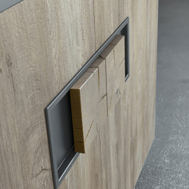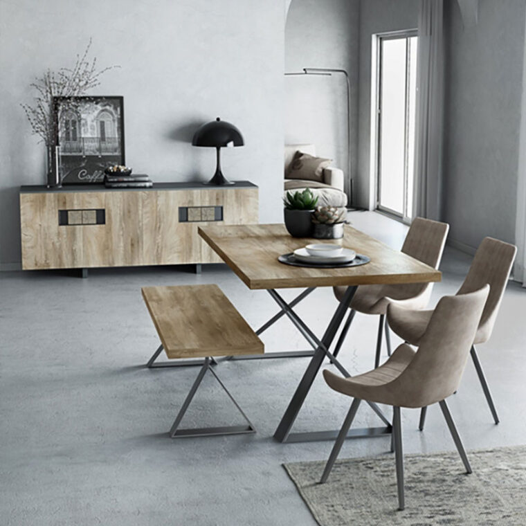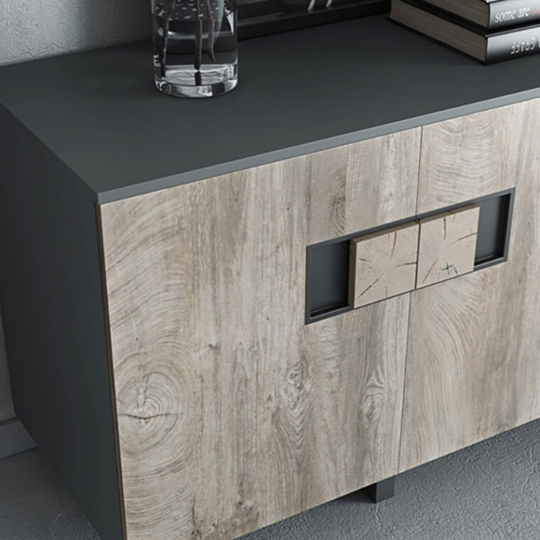 Μπουφές με τεχνοτροπία ξύλου σε φυσική απόχρωση ξύλου σε συνδυασμό με μονόχρωμη λάκα. Ιδιαίτερη πινελιά το πόμολο από μασίφ κορμό και μέταλλο. Κατασκευάζεται και σε άλλες διαστάσεις καθώς και άλλους χρωματικούς συνδυασμούς.