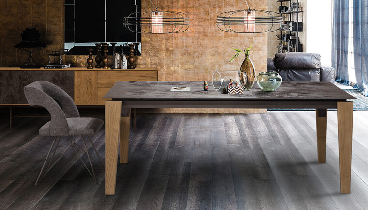 Τραπέζι με κεραμική προέκταση ματ και μεταλλικό σκελετό και πόδια δρυς ρουστίκ.