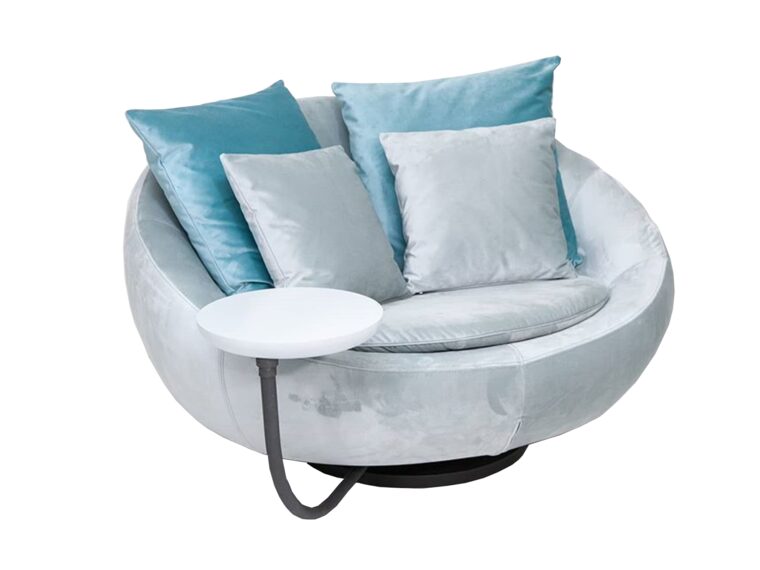 Μια πολυθρόνα με ιδιαίτερο στυλ. Δίνει στο χώρο σας χαρακτήρα και προσωπικότητα. Διαθέτει περιστρεφόμενη βάση και τραπεζάκι που μετακινείται σε όποια πλευρά θέλετε. Πολυθρόνα για έναν ή για δύο. Η καλύτερη επιλογή για να χαλαρώσει κάποιος με άνεση. Είναι κατασκευασμένη από ξύλο οξιάς λευκής ξυλείας, πλακάζ, μασίφ σίδερο, και αφρώδη υλικά. Η μεταλλική της βάση μπορεί να βαφτεί σε διαφορετικά χρώματα ηλεκτροστατικής βαφής. Διατίθεται σε χρωματική ποικιλία αδιάβροχων, αλέκιαστων, easy-clean υφασμάτων. Χωρίς δυνατότητα αλλαγής διαστάσεων.