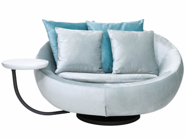 Μια πολυθρόνα με ιδιαίτερο στυλ. Δίνει στο χώρο σας χαρακτήρα και προσωπικότητα. Διαθέτει περιστρεφόμενη βάση και τραπεζάκι που μετακινείται σε όποια πλευρά θέλετε. Πολυθρόνα για έναν ή για δύο. Η καλύτερη επιλογή για να χαλαρώσει κάποιος με άνεση. Είναι κατασκευασμένη από ξύλο οξιάς λευκής ξυλείας, πλακάζ, μασίφ σίδερο, και αφρώδη υλικά. Η μεταλλική της βάση μπορεί να βαφτεί σε διαφορετικά χρώματα ηλεκτροστατικής βαφής. Διατίθεται σε χρωματική ποικιλία αδιάβροχων, αλέκιαστων, easy-clean υφασμάτων. Χωρίς δυνατότητα αλλαγής διαστάσεων.