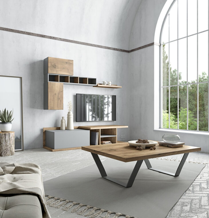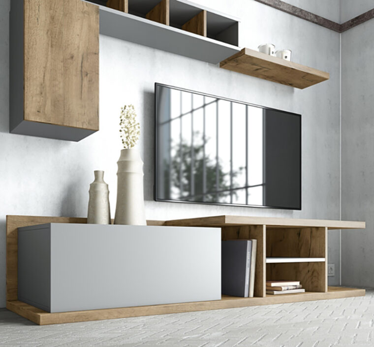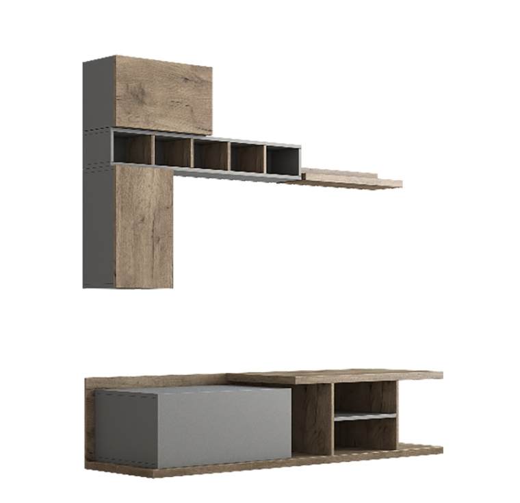 Σύνθεση με τεχνοτροπία ξύλου σε απόχρωση καρυδιάς σε συνδυασμό με γκρι . Αποτελείται από βάση με αποθηκευτικό χώρο και ράφια και επίτοιχη ραφιέρα με 2 ντουλάπια. Διατίθεται σε μεγάλη ποικιλία χρωματικών συνδυασμών