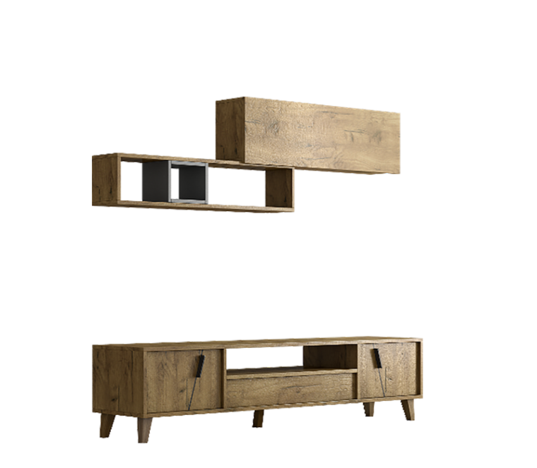 Σύνθεση με διαχρονικό σχέδιο σε τεχνοτροπία ξύλου σε καρυδί απόχρωση, αποτελούμενη από βάση με 2 ντουλάπια και συρτάρι, επίτοιχο ντουλάπι και επίτοιχη ραφιέρα. Διαθέσιμο και σε άλλες αποχρώσεις.