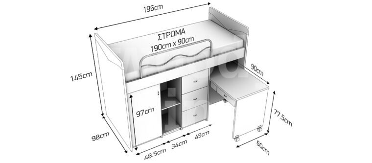 Η διάσταση του στρώματος που επιδέχεται η κουκέτα είναι 90*190.