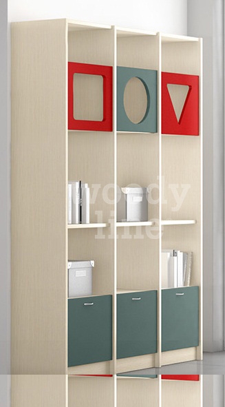 Παιδική βιβλιοθήκη με έξι ντουλάπια, τα τρία με άνοιγμα σε μορφή σχήματος που προσφέρουν λειτουργικότητα.