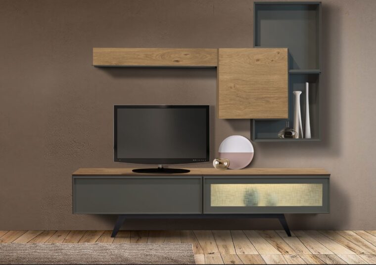 Σύνθεση σε δρυς ρουστίκ με λάκα, με τζάμι με τεχνοτροπία, κρυφό φωτισμό και μεταλλική βάση.