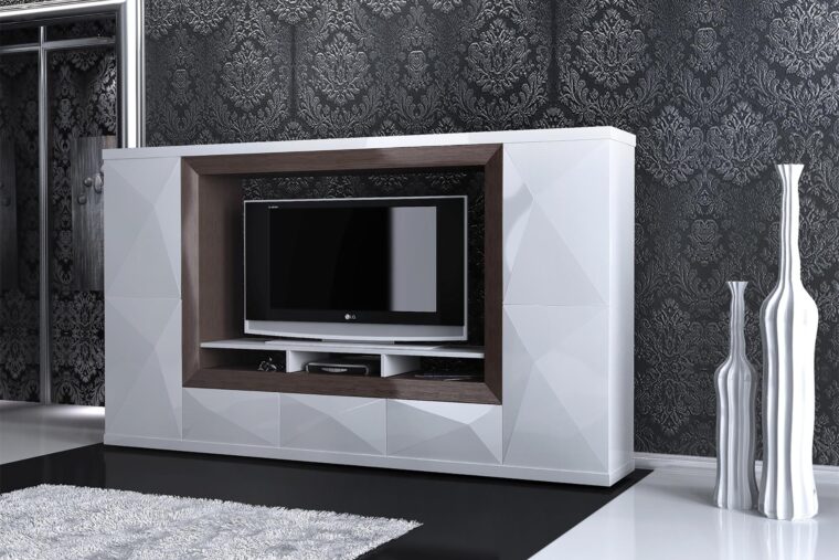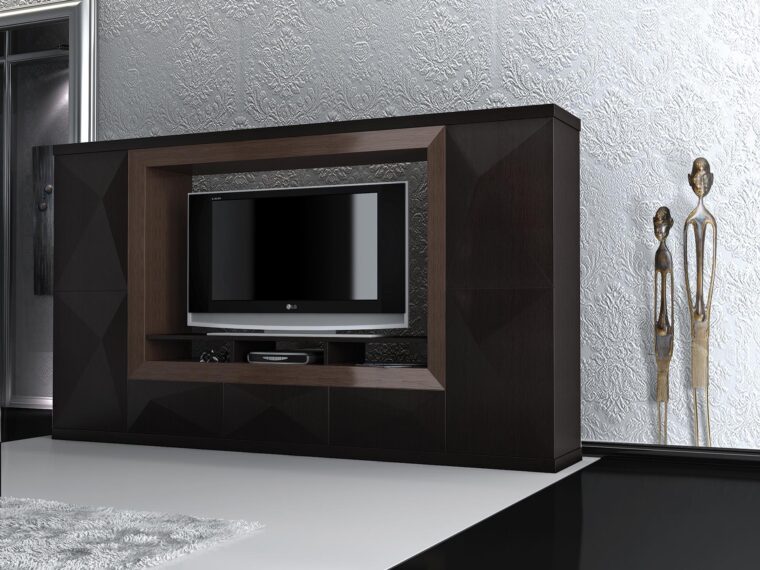Σύνθεση σε δρυ ή καρυδιά. Είναι διαθέσιμο και σε λάκα γυαλιστερή. Οι 4 πόρτες και τα 3 συρτάρια είναι σε πυραμιδοειδή μορφή με σύστημα ανοίγματος push-pull.