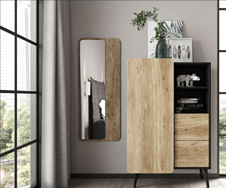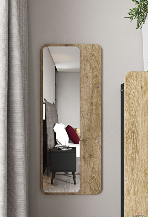 Ο ολόσωμος καθρέπτης Pop Collection είναι κατασκευασμένος από τεχνητό καπλαμά και διαθέτει τέσσερα σημεία κρέμασης στην μπροστινή του όψη. Τα διαθέσιμα χρώματα του τεχνητού καπλαμά είναι το Cashmere grey rustic oak (m.21), Natural rustic oak (m.18) και Light brown rustic oak (m.22).