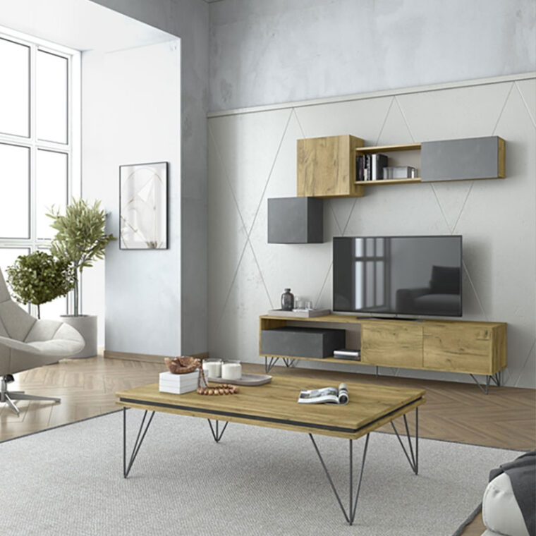 Μοντέρνο τραπέζι σαλονιού σε φυσική απόχρωση με συνδυασμό τεχνοτροπίας πέτρας και ιδιαίτερη λεπτομέρεια τα μεταλλικά πόδια. Είναι διαθέσιμο και σε άλλους χρωματικούς συνδυασμούς.