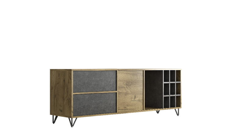 Μοντέρνος μπουφές με τεχνοτροπία σε απόχρωση φυσικού ξύλου και λεπτομέρειες σε τεχνοτροπία πέτρας. Έχει γκρι μεταλλικά πόδια και διαθέτει 3 ντουλάπια με μεγάλους αποθηκευτικούς χώρους και κάβα. Δυνατότητα επιλογής χρωμάτων.