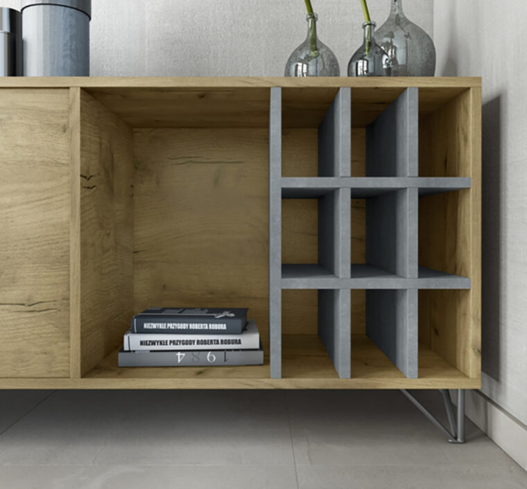 Μοντέρνος μπουφές με τεχνοτροπία σε απόχρωση φυσικού ξύλου και λεπτομέρειες σε τεχνοτροπία πέτρας. Έχει γκρι μεταλλικά πόδια και διαθέτει 3 ντουλάπια με μεγάλους αποθηκευτικούς χώρους και κάβα. Δυνατότητα επιλογής χρωμάτων.